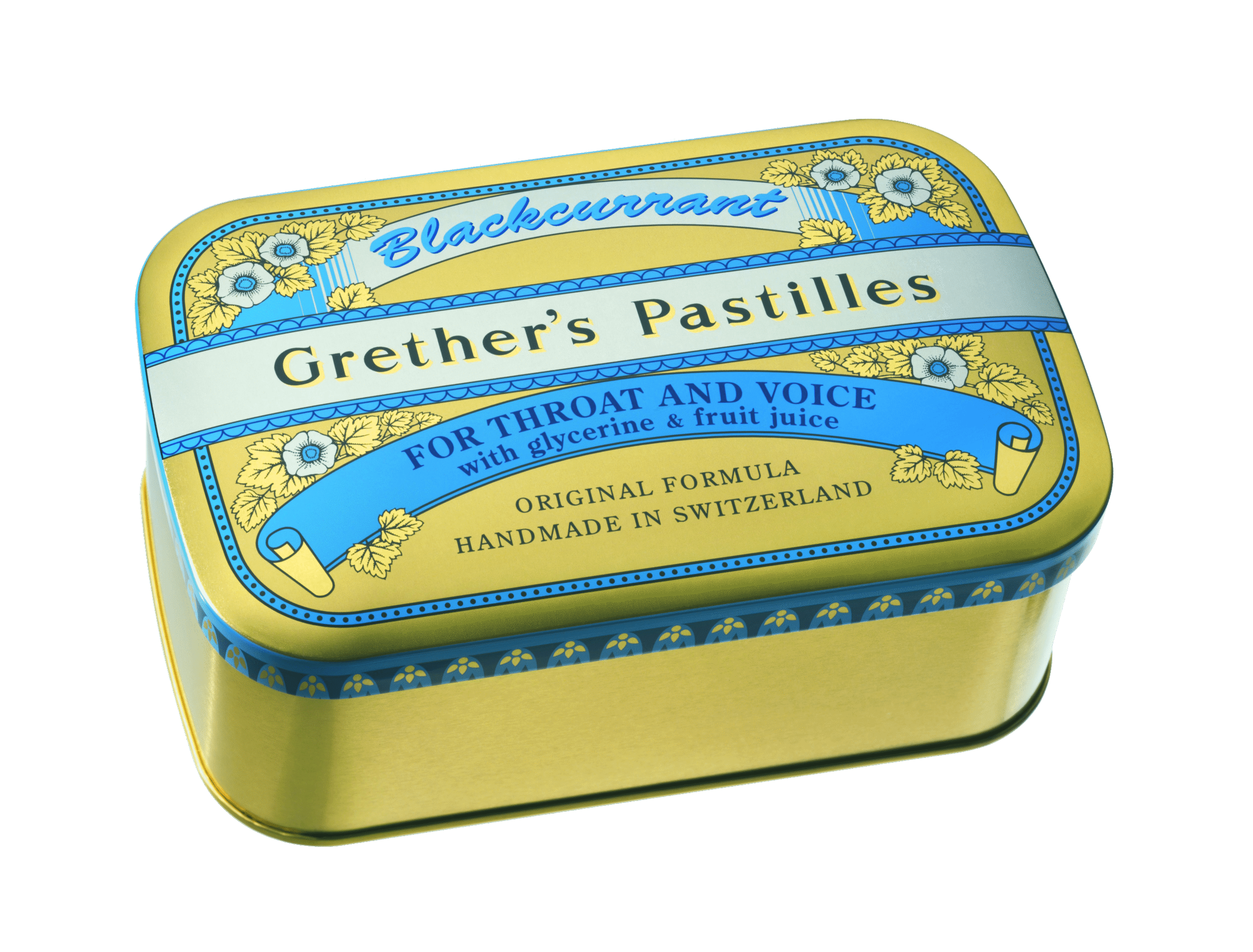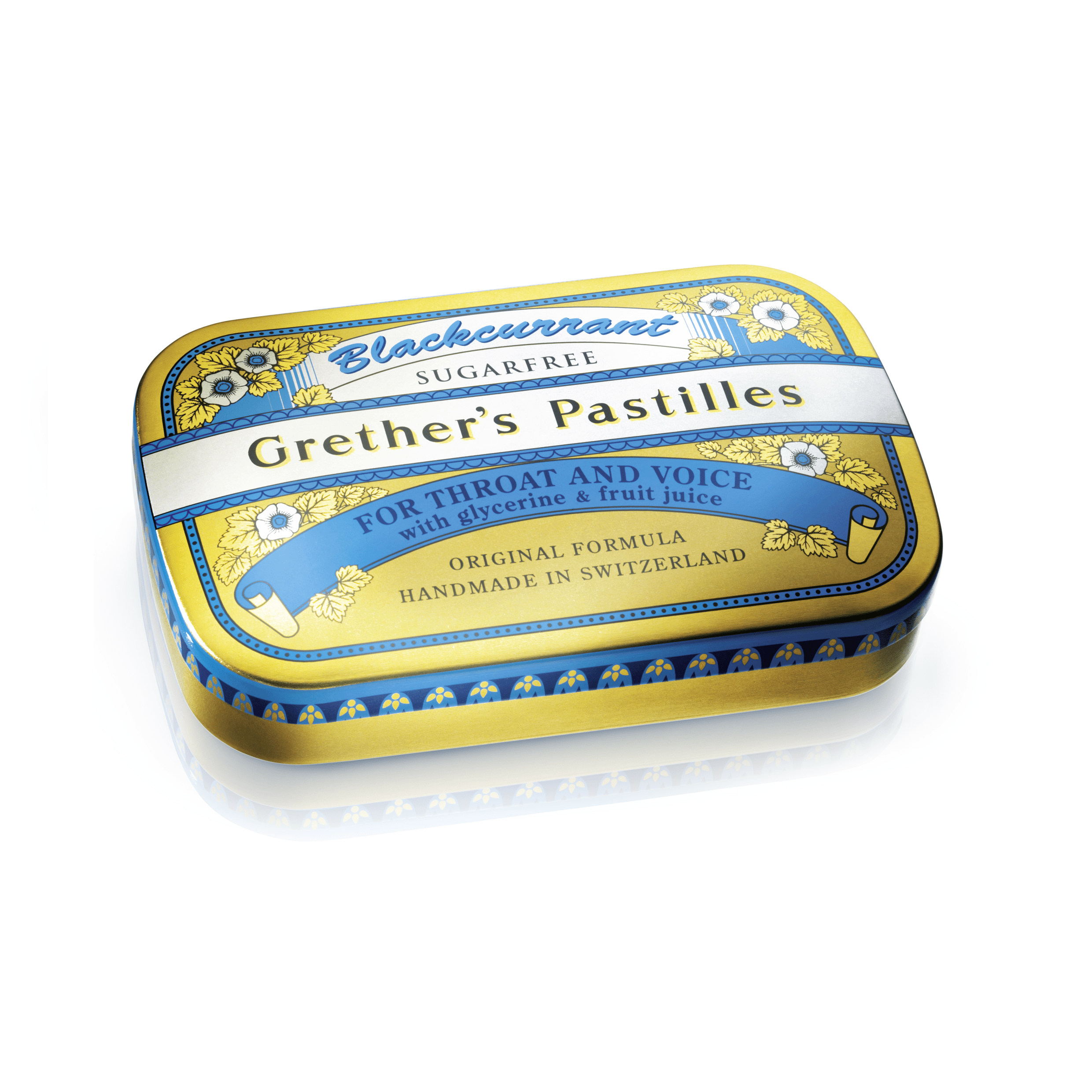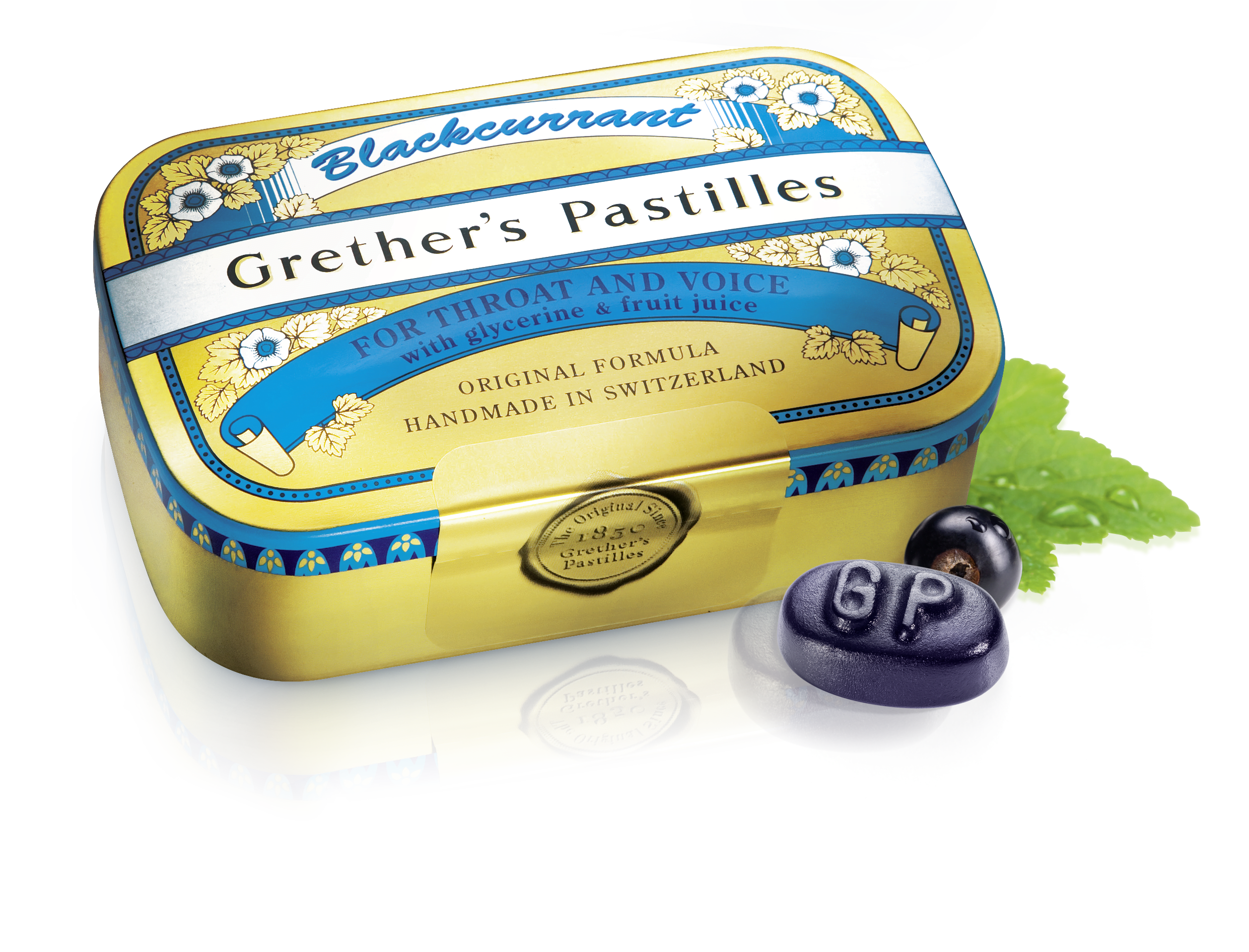 The incomparable fruity yet mild essence gives these soothing pastilles their distinct flavour and deep dark colour. Grether’s Pastilles Blackcurrant are available with sugar and as a sugar-free version sweetened with maltitol syrup and acesulfame-K.