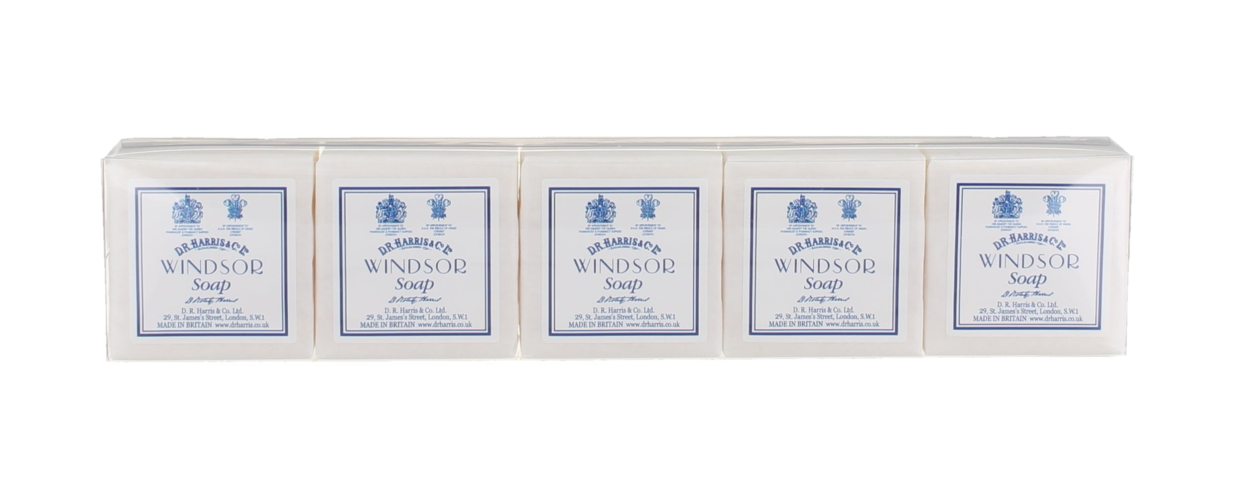 A pack of 5 40g bars of Windsor soap. Ideal for use as a guest soap or for travel, one bar will last at least 10 days. Triple-milled for long-lasting, luxurious lather and fragranced with Windsor: grapefruit, black pepper and vetiver.