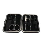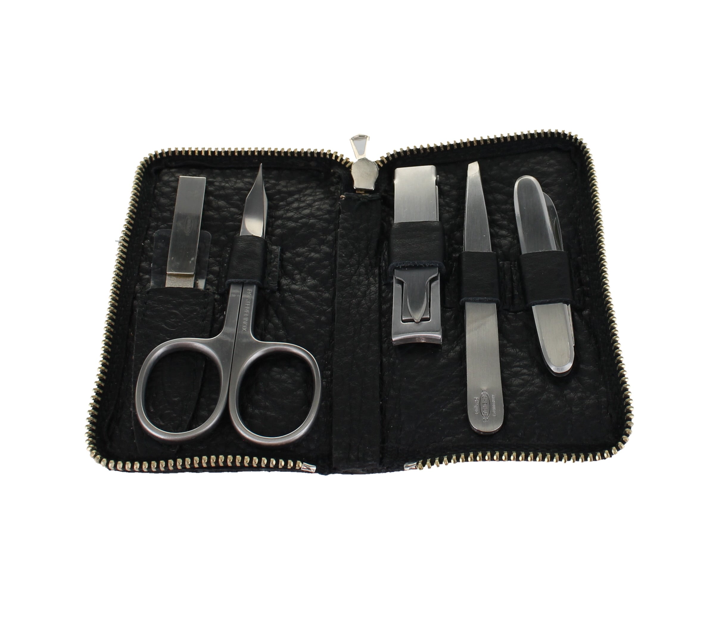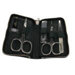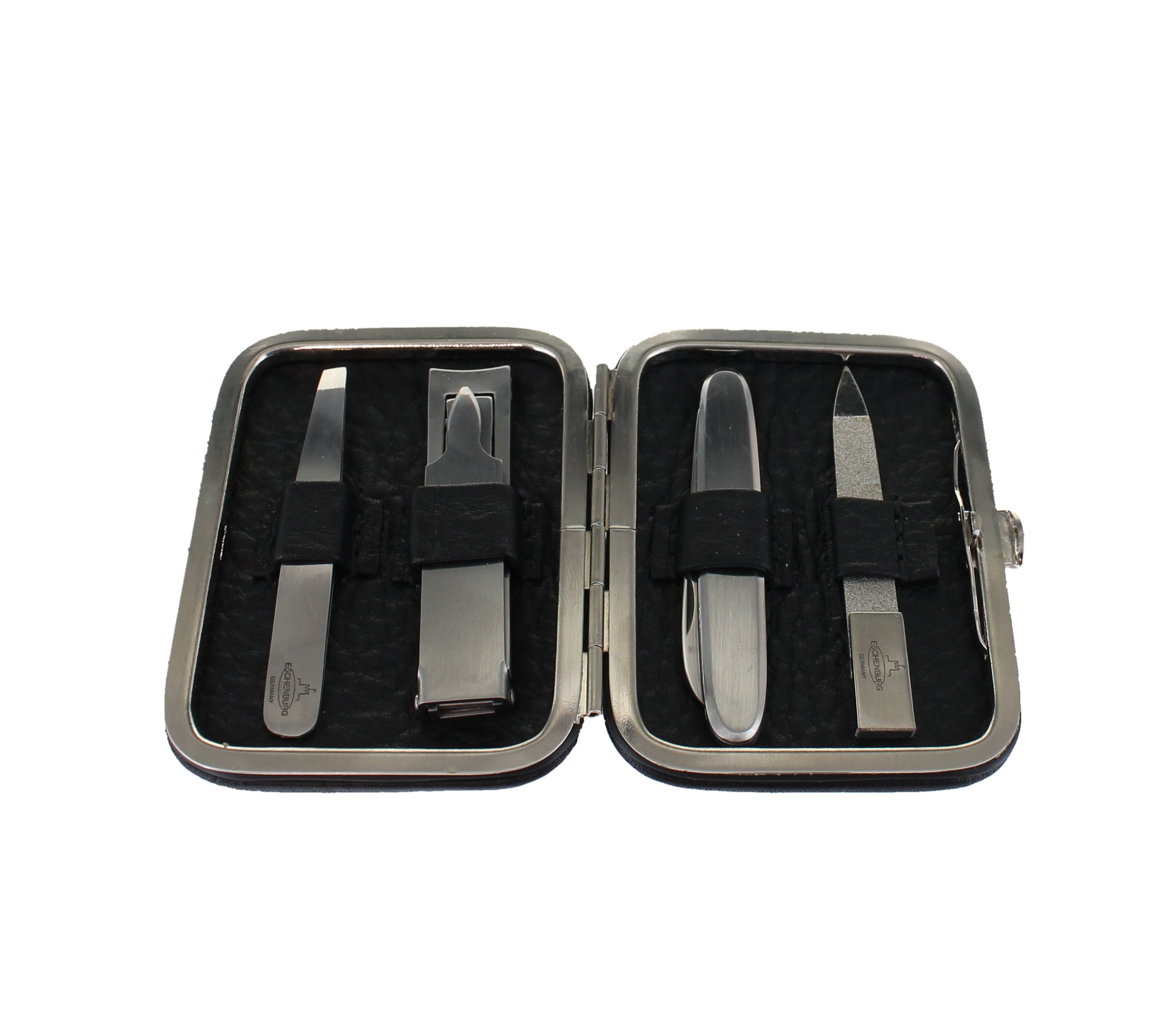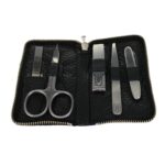 This 4 piece manicure set comes in a delightful black leather hard case. This set includes tweezers, nail file, nail clipper and pen knife.