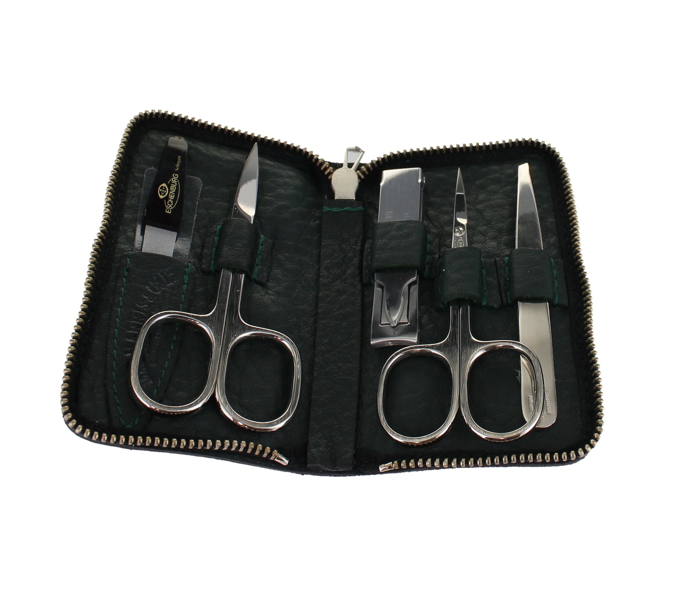 This 5 piece manicure set comes in a delightful green leather zippable case. This set includes tweezers, nail file, cuticle scissors, nail clippers, and nail scissors.