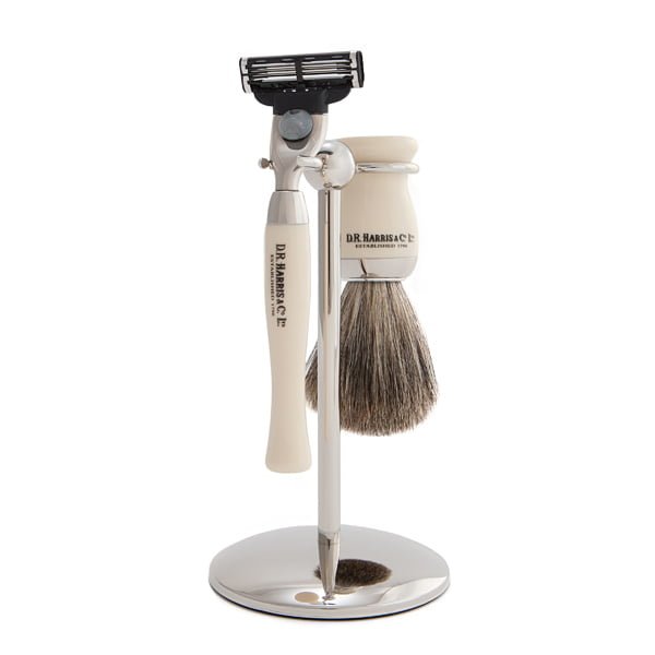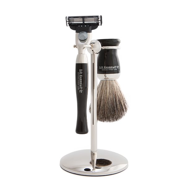 An elegant 3-piece shaving set embossed with the D. R. Harris logo which will look stunning in any bathroom. Double-edged blades offer more control in areas where more detail and precision is required such as sideburns and under the nose. Many users find double-edged blades, once mastered, offer less irritation than cartridge blades. Double-edged blades are cheaper to replace and contain no plastic packaging, making this a sound shaving choice environmentally.